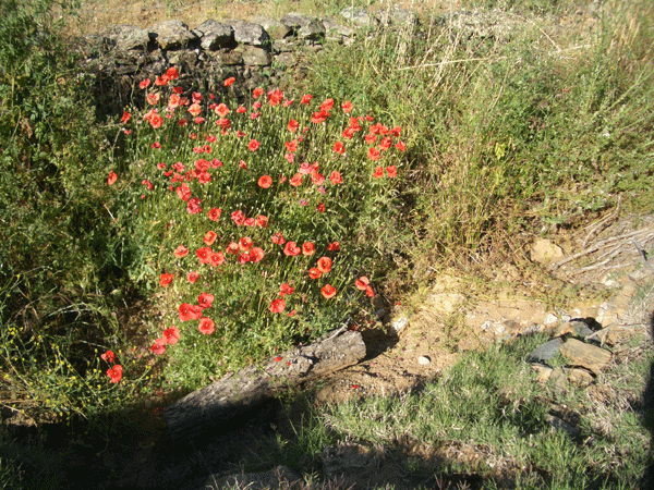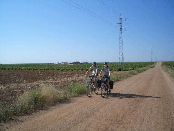 Was die Via de la Plata aber noch ausmacht, ist die wunderbare Landschaft Süd- und Mittelspaniens mit ihrer auch im Juni noch vorhandenen Farbenpracht und teilweise unendlichen Weite. Es verging fast kein Tag an dem wir nicht durch Naturparks pilgerten, wo wir kaum mal eine Menschenseele trafen. Steineichen, Korkeichen, Olivenbäume oder gar Weinstauden spendeten uns jedoch leider nur wenig Schatten, so dass wir im Laufe des oft weit in den Tag hinein dauernden Pilgerns ordentlich ins Schwitzen kamen. Exemplarisch sei hier die Etappe von Villafranca de los Barros nach Torremegina erwähnt. 30 km ging es nur durch Weinfelder soweit rund herum das Auge reichte. Hier war Wasser das wichtigste Lebensmittel. Die anderen Wohltaten für „Bruder Leib“ blieben dem Abend vorbehalten.