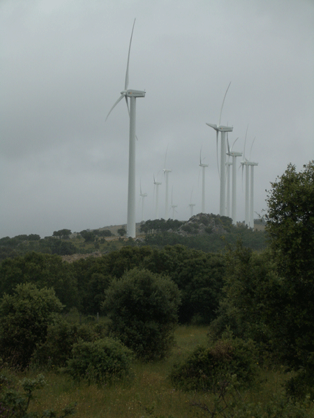 Neben der Länge der Etappe gilt es den Pass des Pico de la Duena auf schwierigen Pfaden zu bezwingen. Bei schlechtem Wetter nicht einfach. Beeindruckend das Gipfelkreuz und der Windpark auf dem Bergkamm.