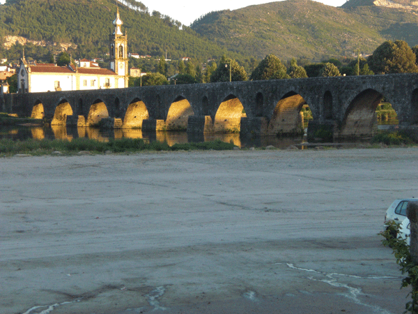 In schöner Landschaft führte der Camino einige Zeit an einer befahrenen Landstraße entlang. Sehenswert die Pilgerbrücke Ponte de Arcos und die Kirche von Arcos mit Azulejos-Zierde. Bemerkenswert der zweifarbige Pilgerstempel im Supermarkt neben! der Pilgerherberge.